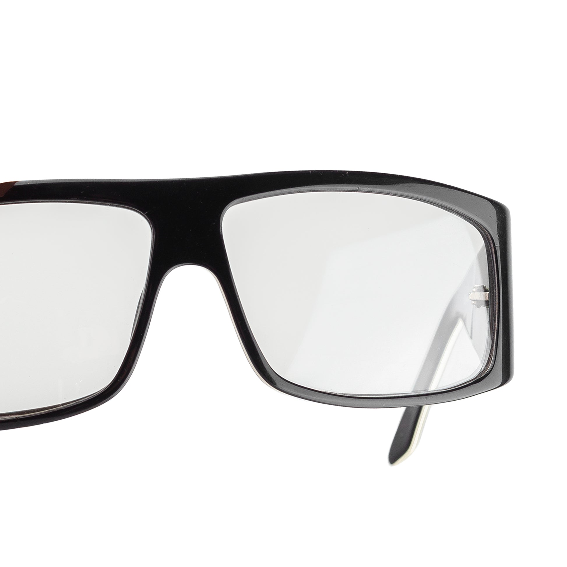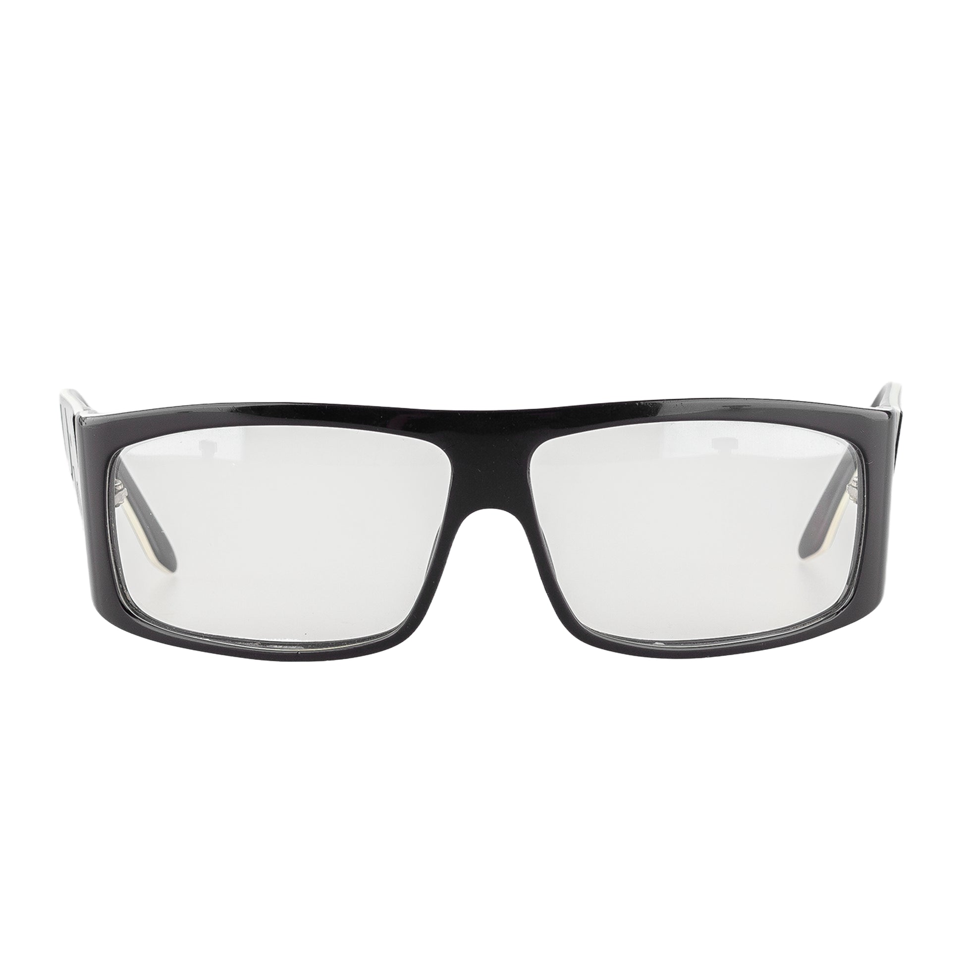 Black acetate & (non-prescription) clear lenses.