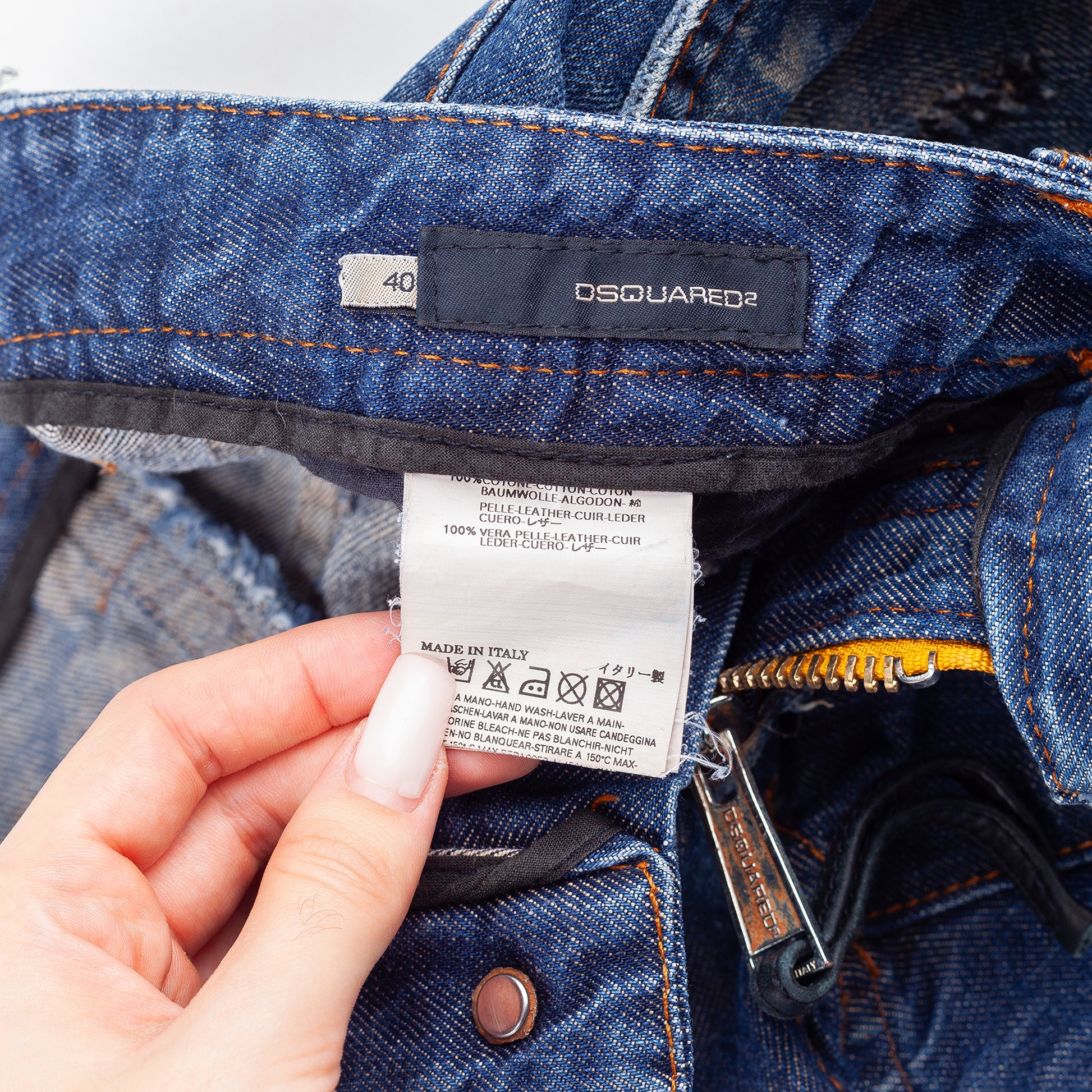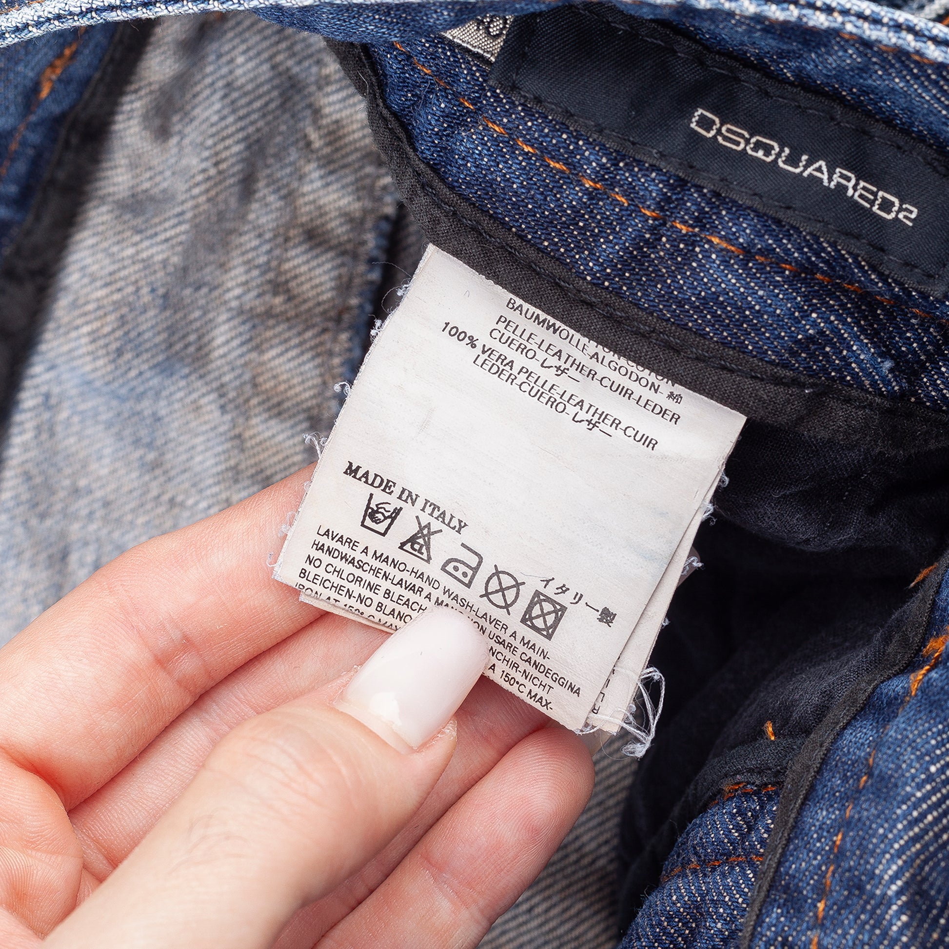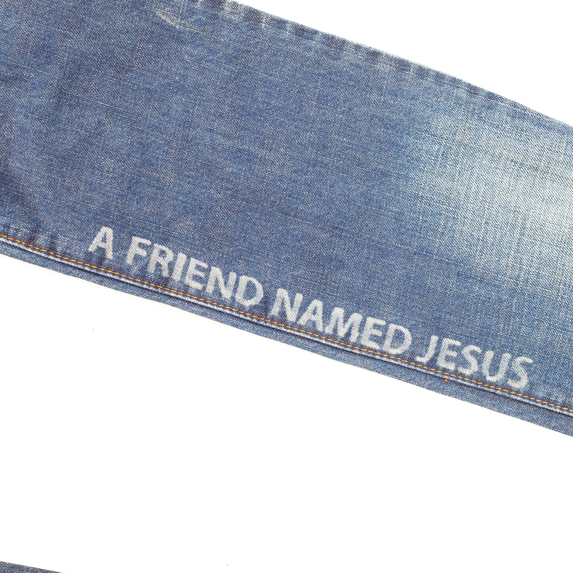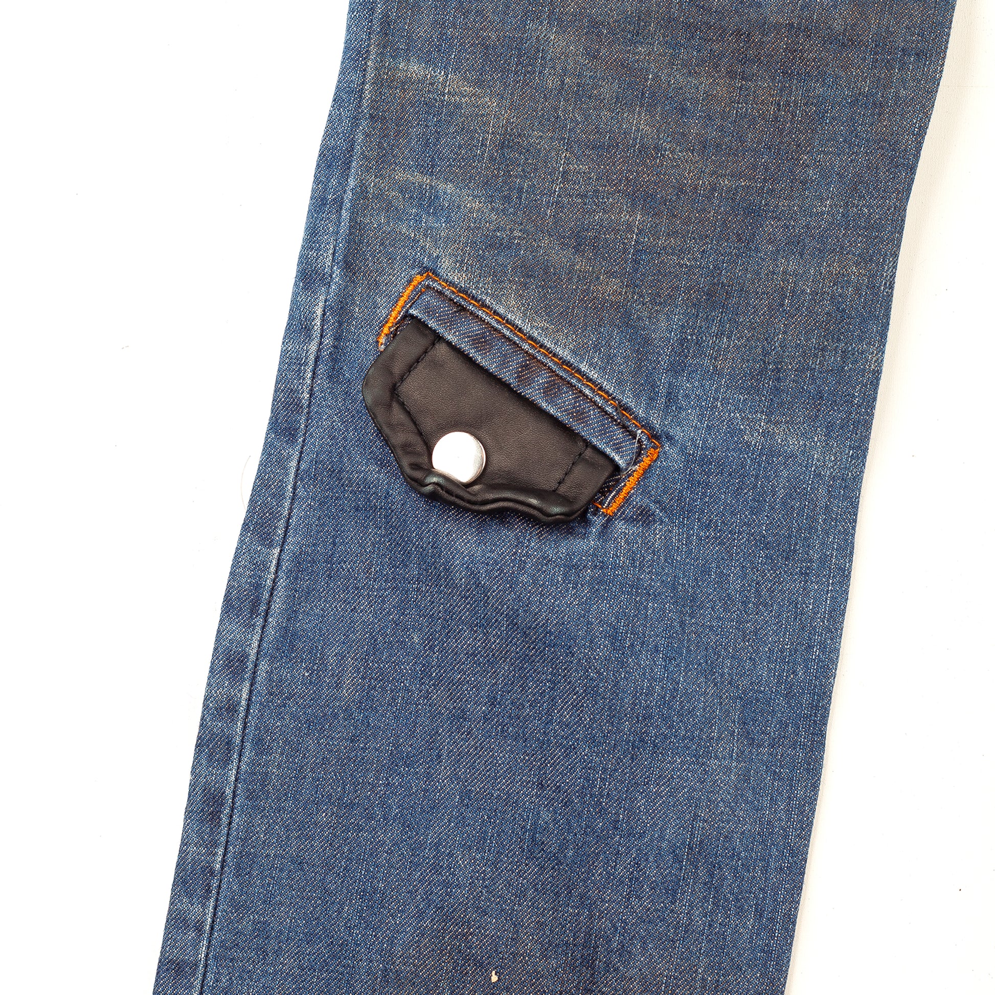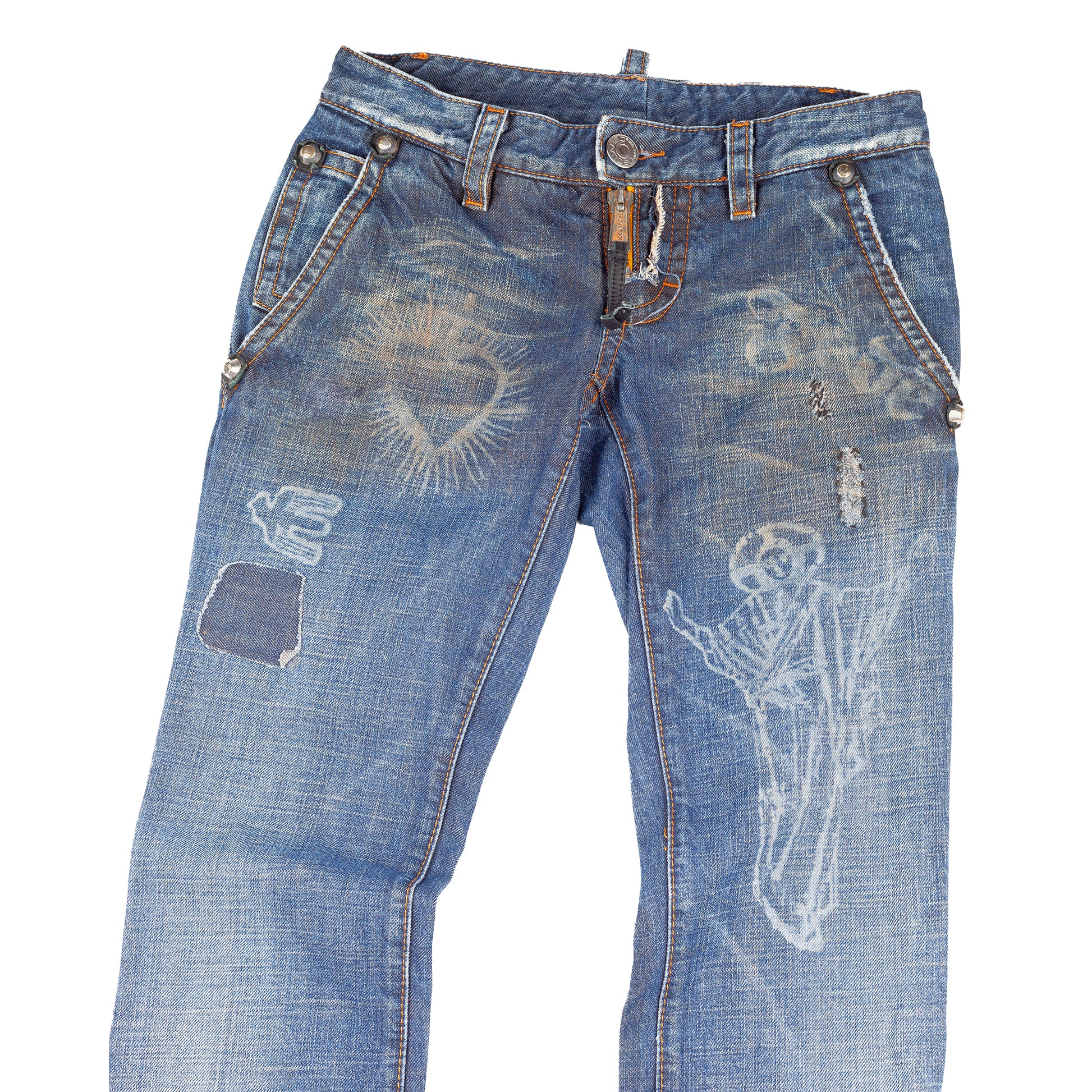 With Christian motifs, low-rise, with a leather pocket on the back. Muddy effect on the denim.