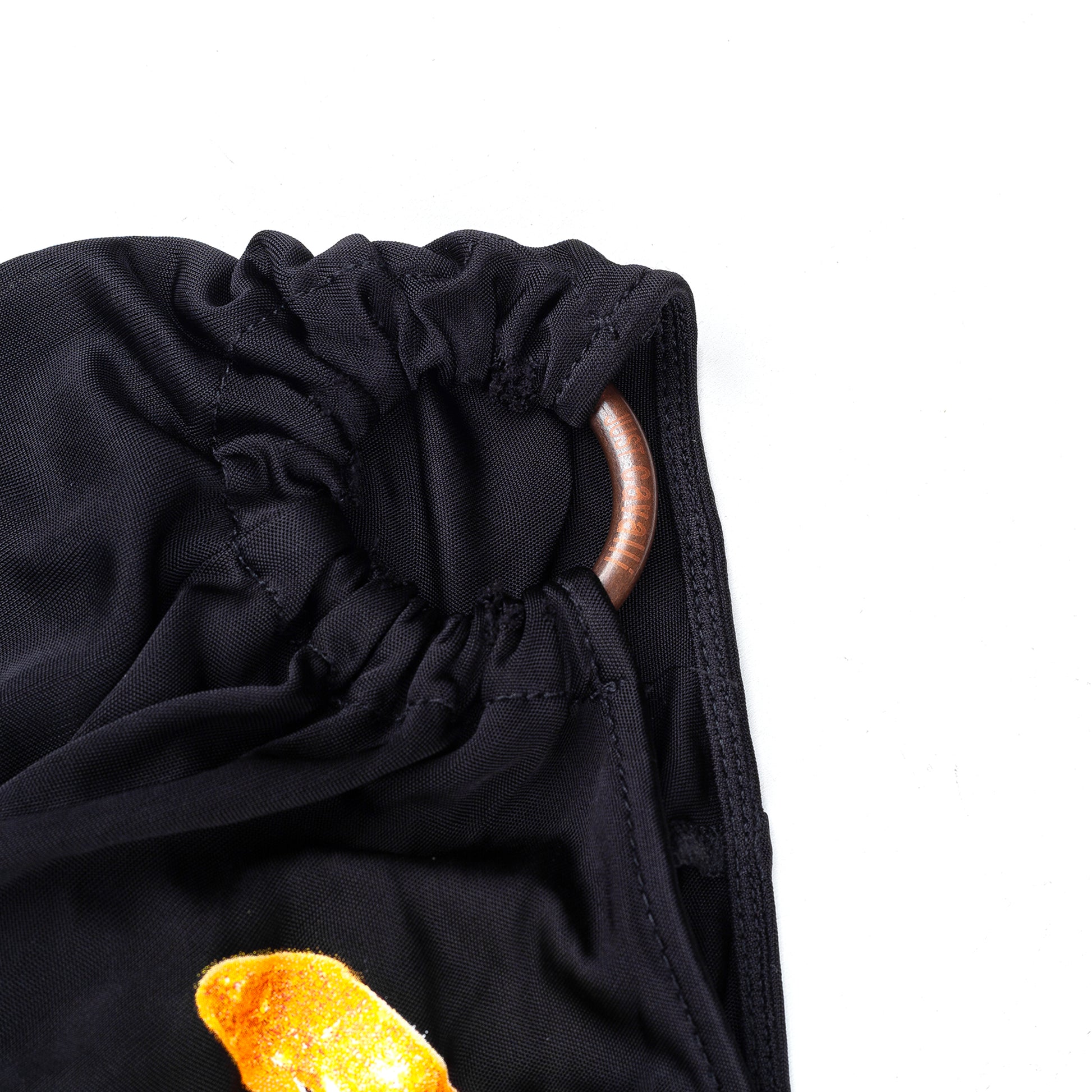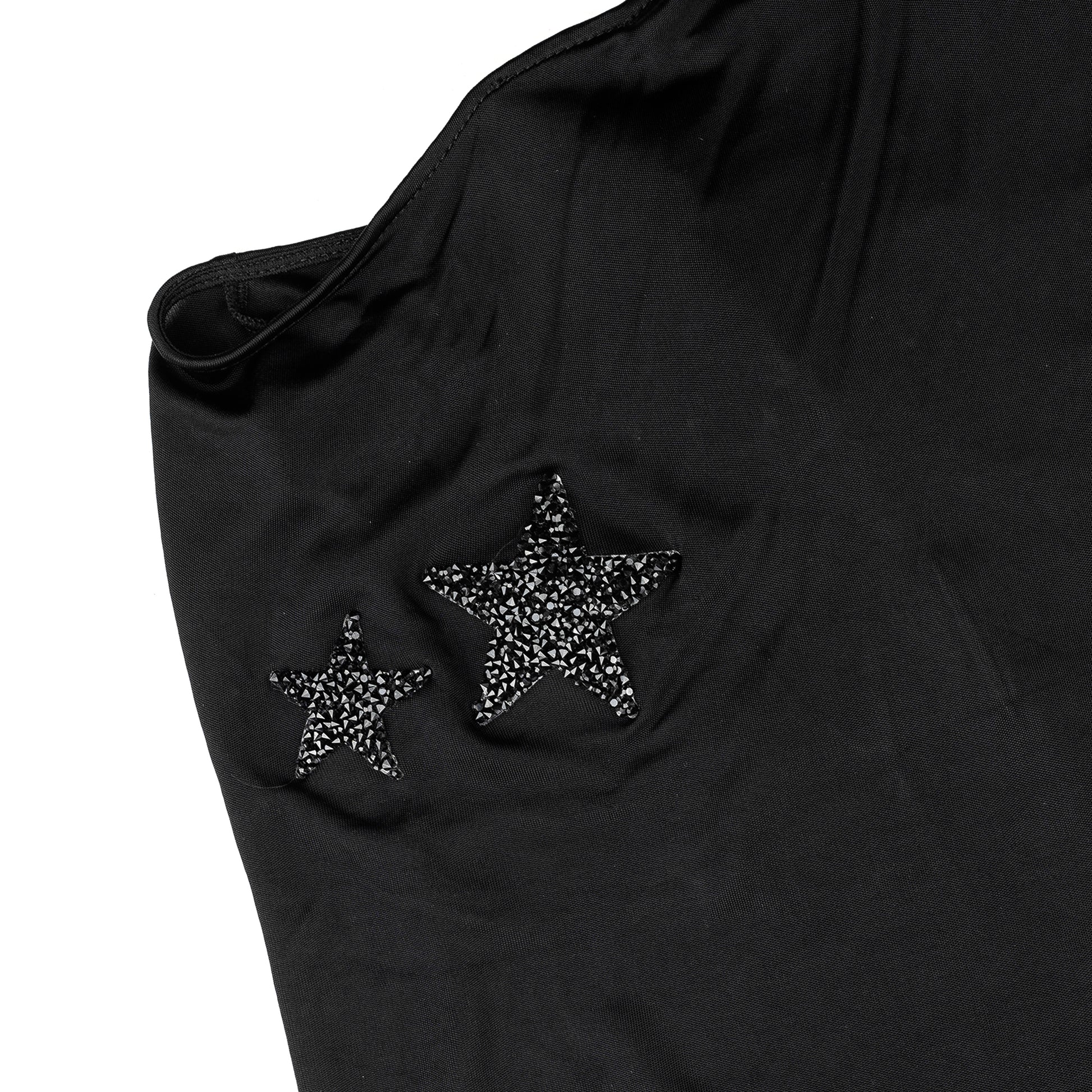 One-shoulder top featuring a jewel-print detail on the sleeve, a metal ring connecting the shoulder, a glossy front graphic, and star accents on the back.