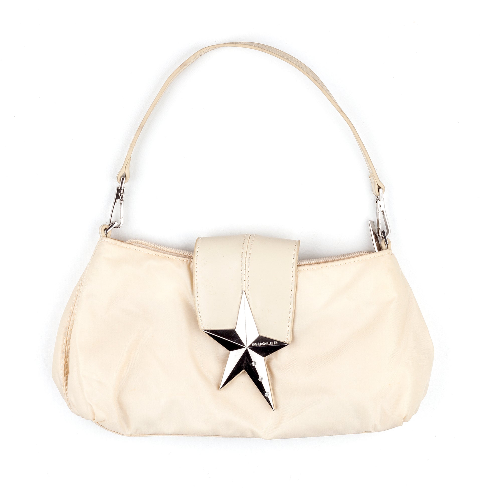 Features a unique star-shaped design, characteristic of Thierry Mugler's iconic style. The shoulder strap is detachable, and the bag includes a longer strap, allowing it to be worn as a crossbody.