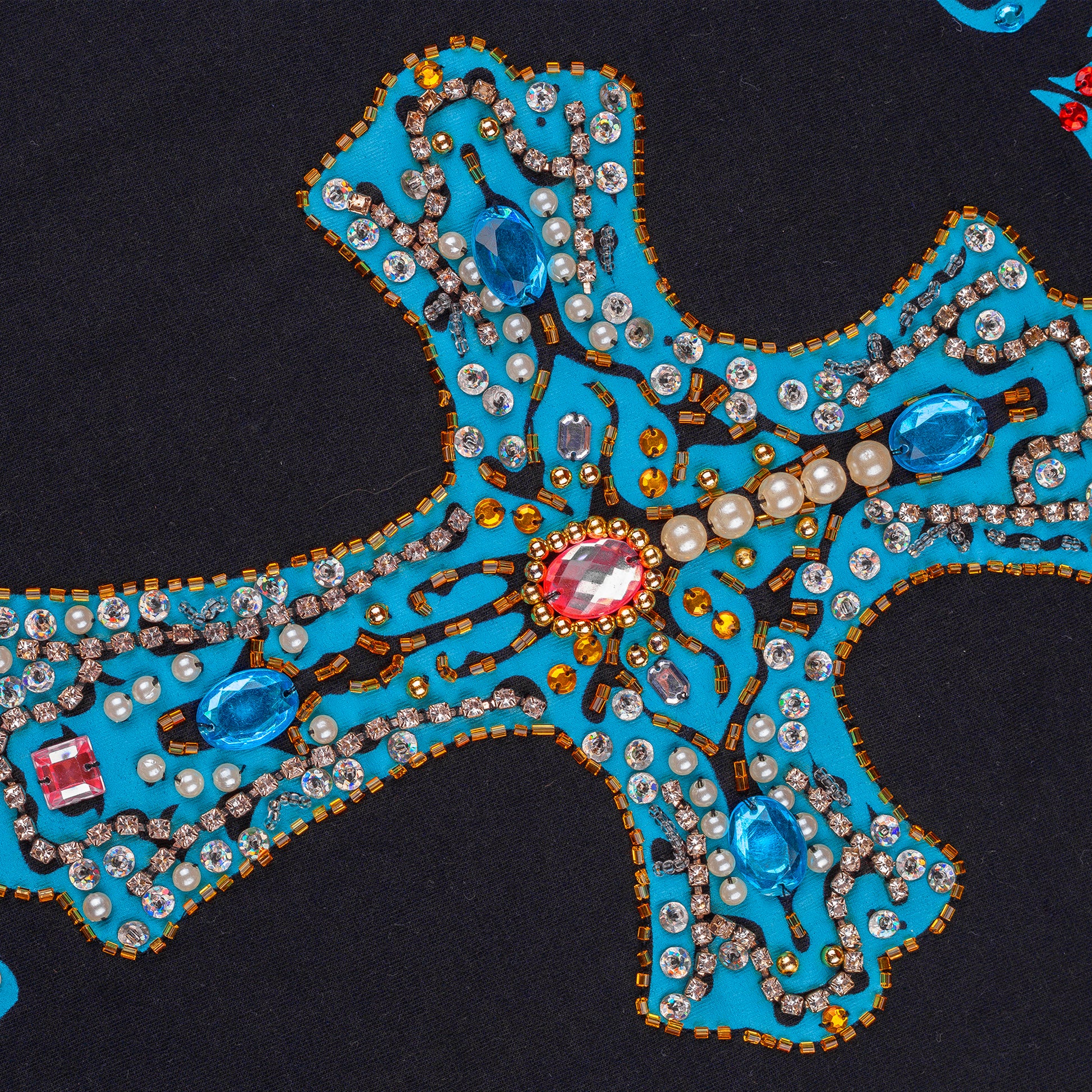 - Features a striking cross adorned with vibrant, multi-colored strass rhinestones