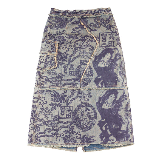 Kenzo Jungle Chinoiserie Oriental Vintage Denim Pencil Midi Skirt (XS)